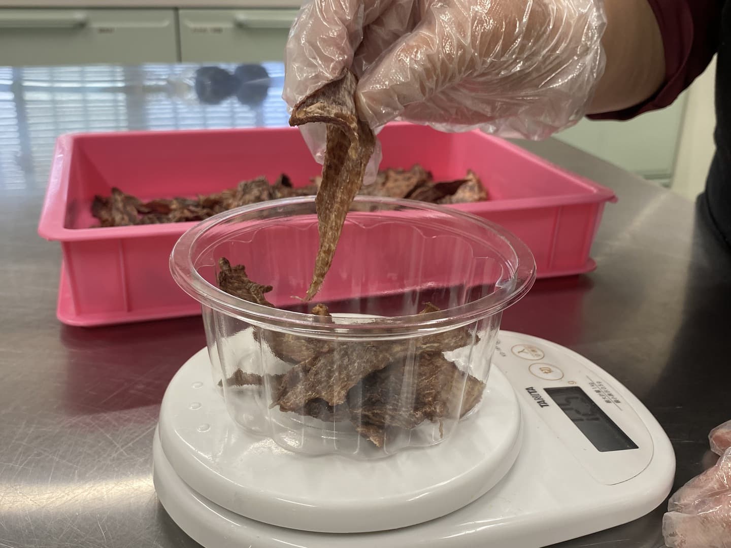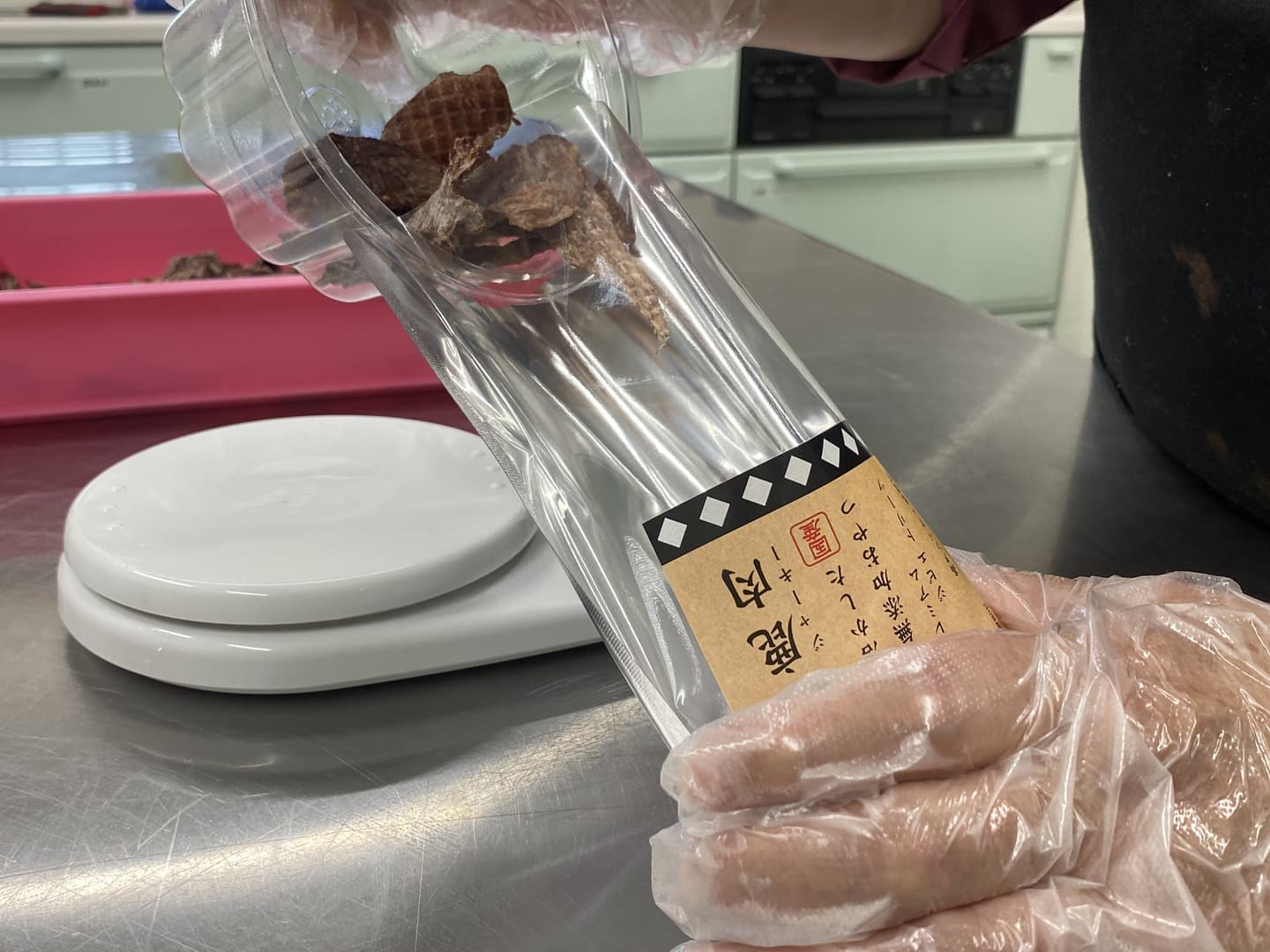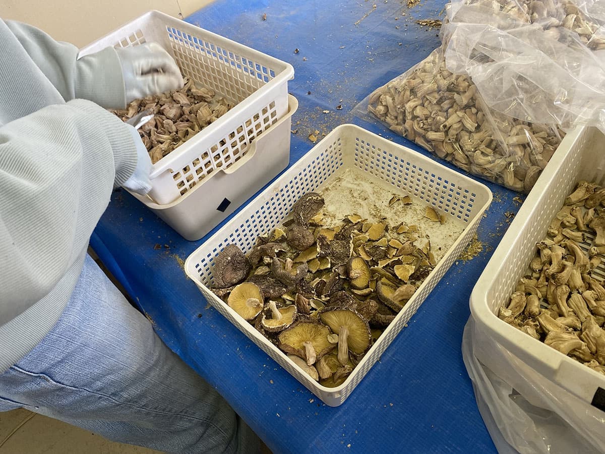 乾燥椎茸(国内産)の足切を行っています。細かい作業も含まれていますが、特に衛生面で手袋、マスク・頭キャップをして丁寧に行っています。