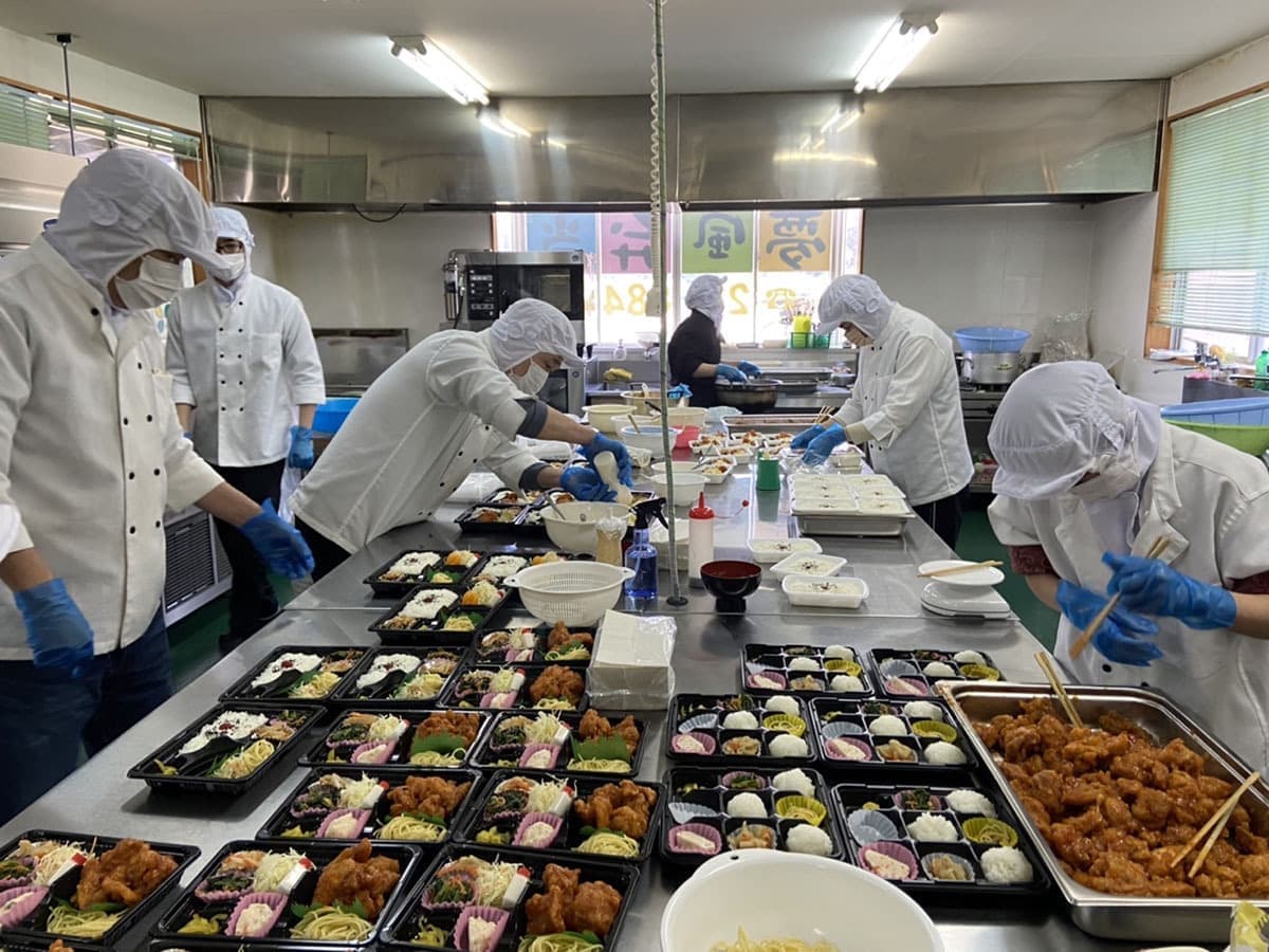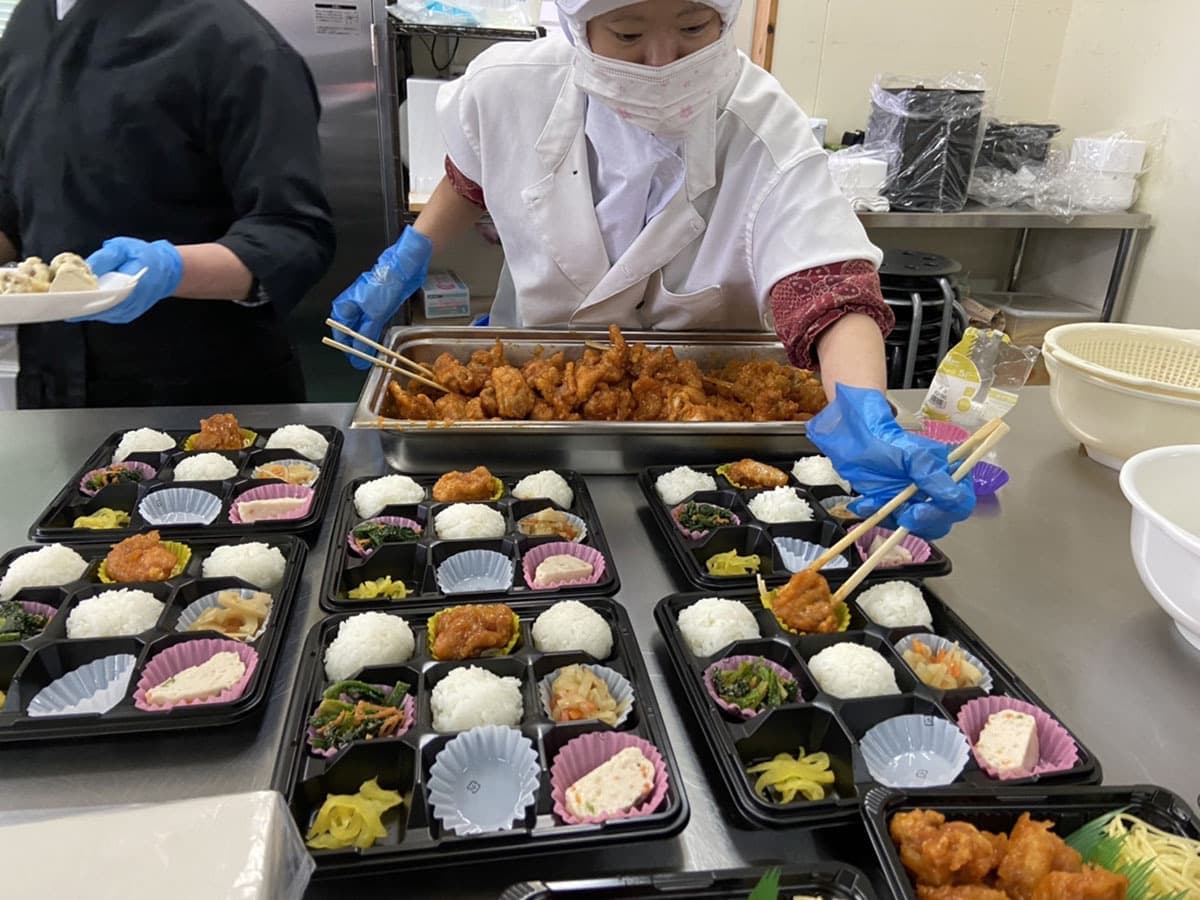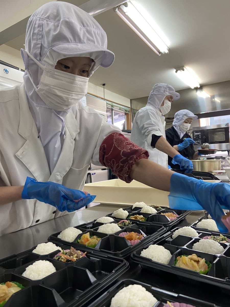ご飯・おかず・カップ入れなどを弁当箱に入れる作業です。衛生面は特に厳しく指導しています。皆さん調理覚えて楽しい食事作りをしませんか!